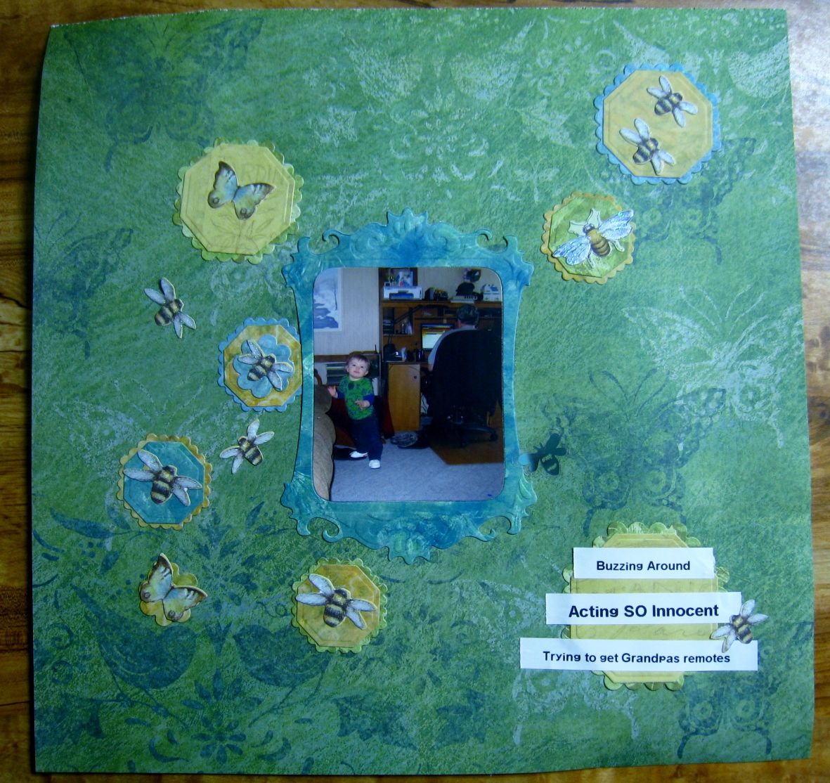 The picture is of my Grandson (of course!) trying to be sneaky! He was playing around the end table trying to grab Grandpa's remotes. He loves pushing buttons... actual buttons and ours! LOL It's a good thing he's so adorable and lovable!